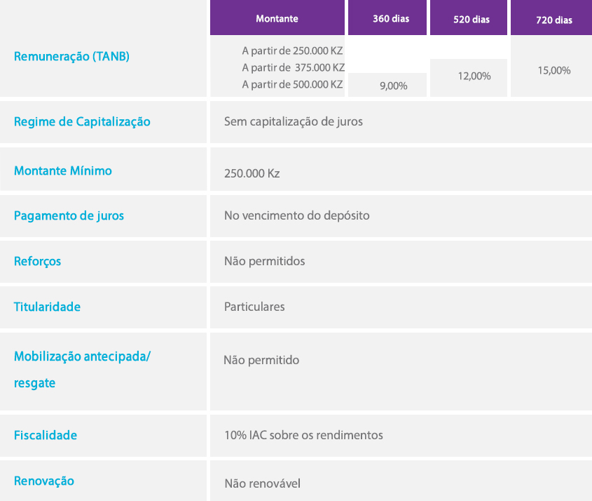 O Rendimento Flexível é uma aplicação a prazo com taxas atractivas variáveis consoante o prazo e montante da aplicação, com um montante mínimo de subscrição de Kz 250.000 e possibilidade de descoberto de até 80% do montante aplicado.