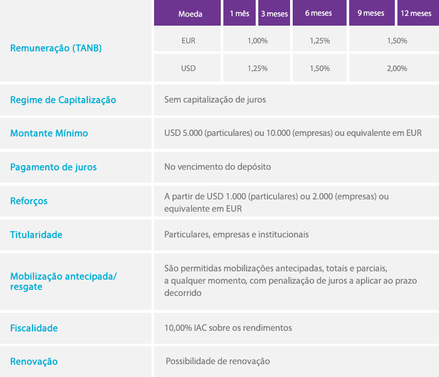 A conta Rendimento ME é uma aplicação a prazo que pode ser subscrita em moeda estrangeira - dólares americanos ou euros - disponível em diferentes prazos de investimento, consoante o objectivo de cada investidor.