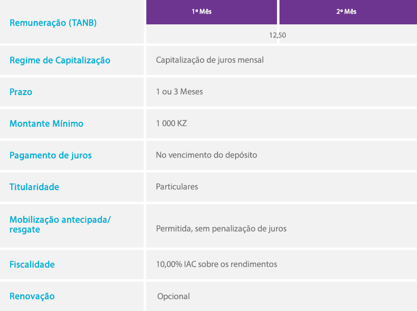 O Depósito a prazo Poupança Bankita a Crescer encontra-se disponível a 1 mês e 3 meses a partir de 1 000 KZ e taxa atractiva de 12,5%.