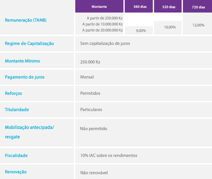 O Rendimento Flexível é uma aplicação a prazo com taxas atractivas variáveis consoante o prazo e montante da aplicação, com um montante mínimo de subscrição de Kz 250.000 e possibilidade de descoberto de até 80% do montante aplicado.